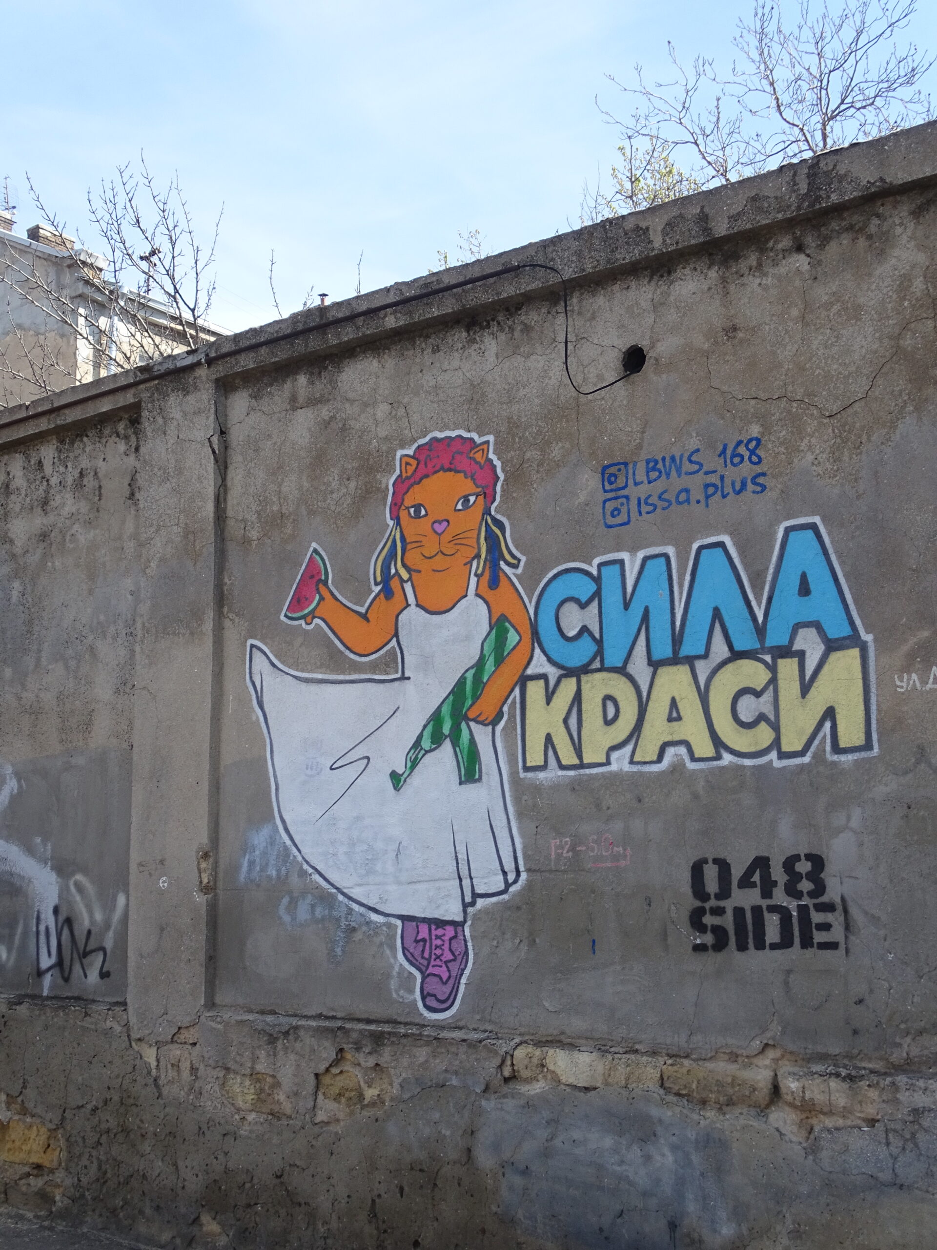 Odessa ist die Ukrainische Katzenhauptstadt (dazu im nächsten Beitrag mehr). Neben lebenden Katzen und Katzenstatuen in Lebensgröße gibt es auch jede Menge Katzengraffiti. Dieses hier mussten aus hoffentlich offensichtlichen Gründen photographieren.