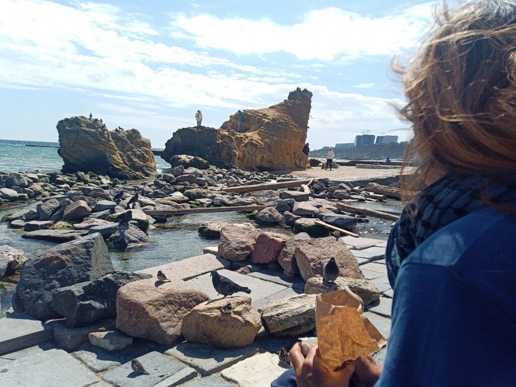 Vom Bahnhof wäre es eigentlich nur ein Katzensprung zum Stadtstrand, wenn wir uns nicht verfahren würden. Aber in diesem Fall gibt es keine falschen Wege, es gibt nur zu entdeckende Ecken. Odessas Stadtstrand ist großartig: lang, feiner Sandstrand, flaches Meer, Promenade, Cafes, Kneipen und Läden. Uns hat es besonders ein sehr kreativer Wasserspielplatz mit Kletterfelsen angetan. Hier gönnen wir uns einen Imbiss. Was hier im Sommer los sein muß!