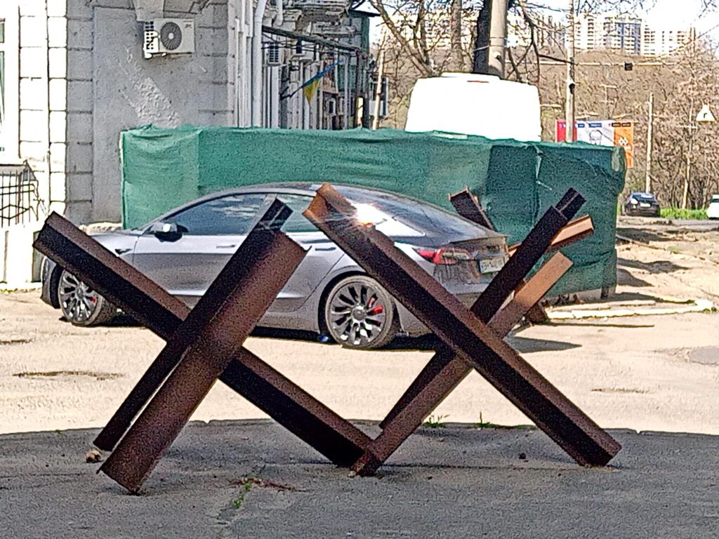 Wir schrieben ja, dass das Fehlen von Checkpoints, Militär und Panzersperren in der Stadt auffällig ist. Auf unserer Radtour sehen wir nur ein einziges Mal einige bereit gestellte Panzersperren, die vermutlich noch vom Beginn der russischen Vollinvasion im Februar 2022 übrig sind und seitdem hier rumstehen.