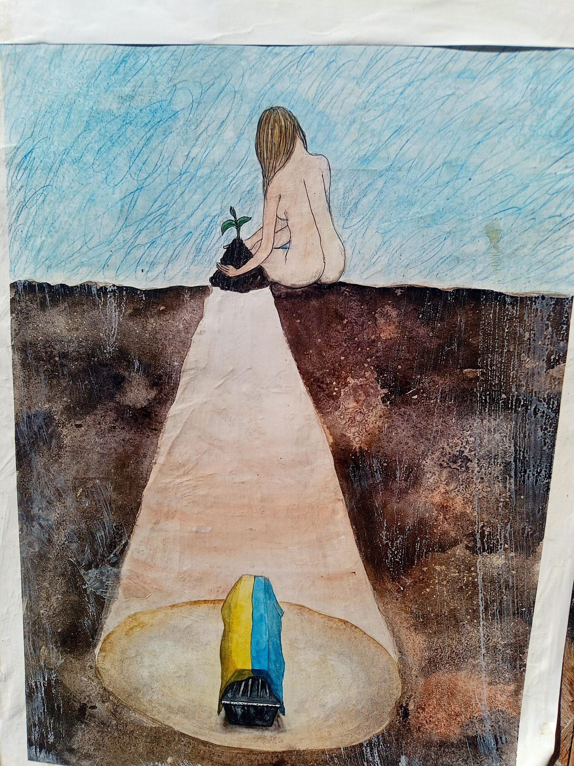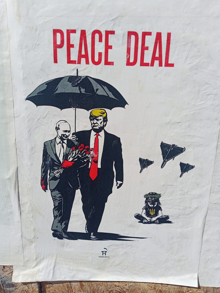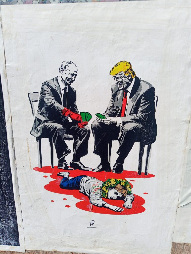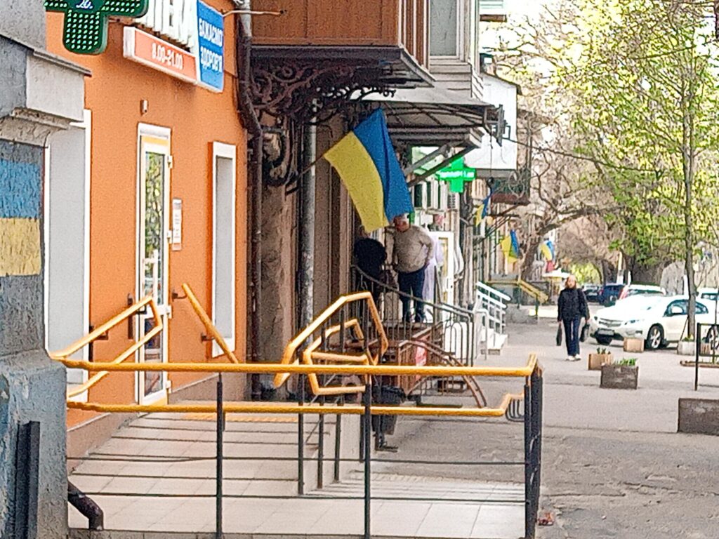 Auf dem Heimweg fällt uns ein, dass wir die ukrainischen Fahnen, die wir überall sehen, im Lichtbild dokumentieren sollten. Es ist eindeutig, dass die Beflaggung nicht vom Staat, von oben angeordnet wurde, sondern dass die Menschen das von sich aus machen.
