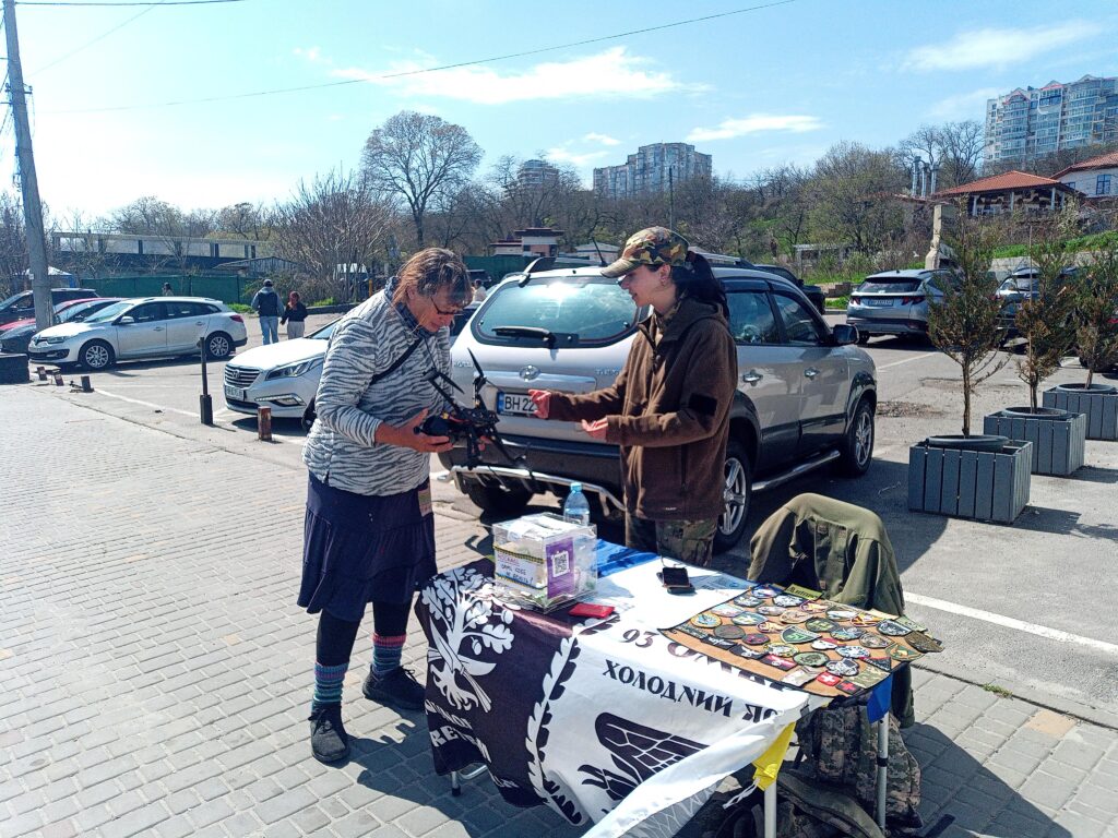 Neben einem Noberestaurants sammelt eine Freiwillige Spenden für mobile OP-Räume für die Front. Als Anschauungsmaterial hat sie eine nicht explodierte russische Kamikazedrohne dabei.